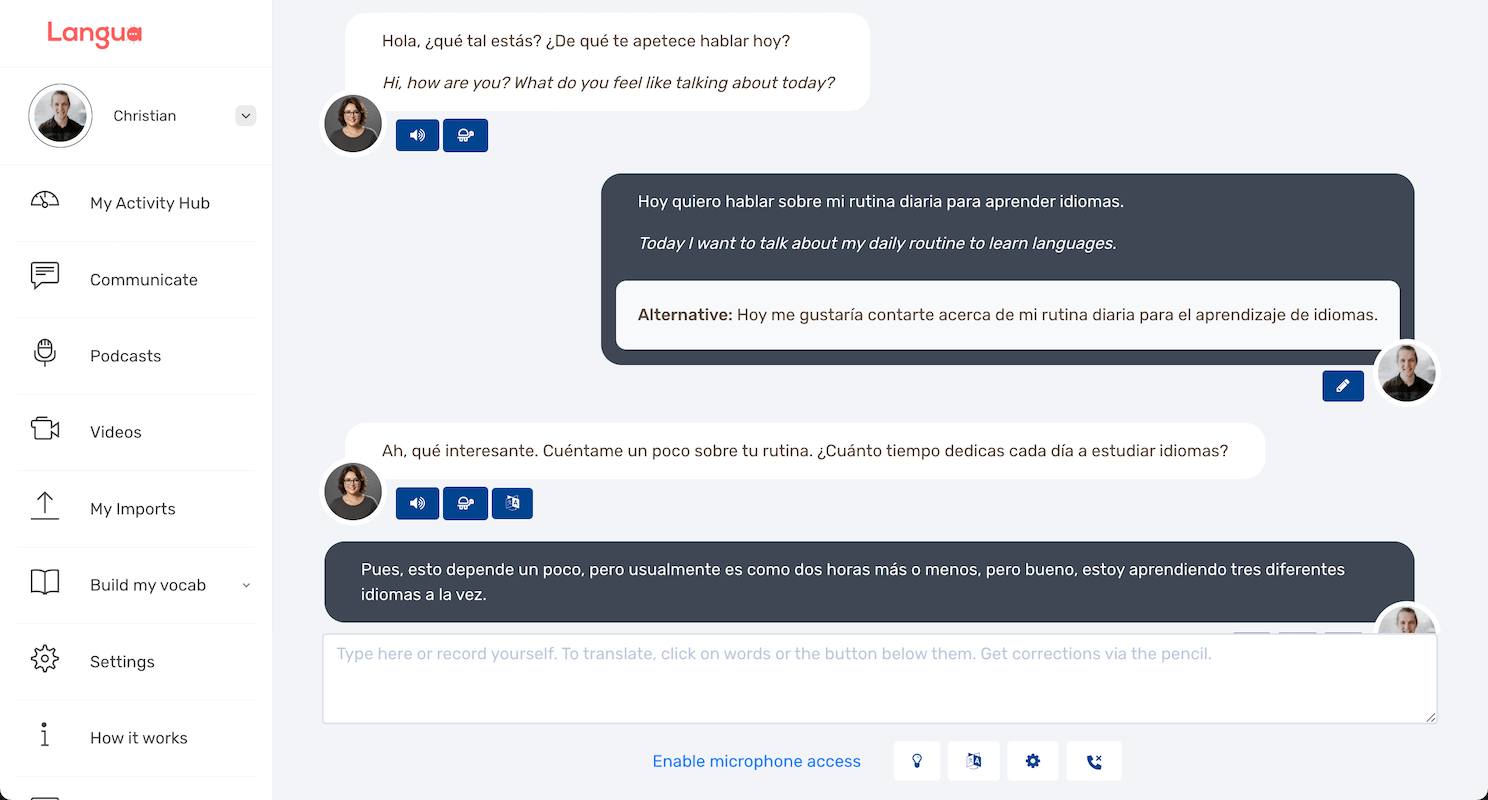 Langua also offers writing feedback and comprehensible input, making it particularly valuable for learners who prefer to use fewer apps.