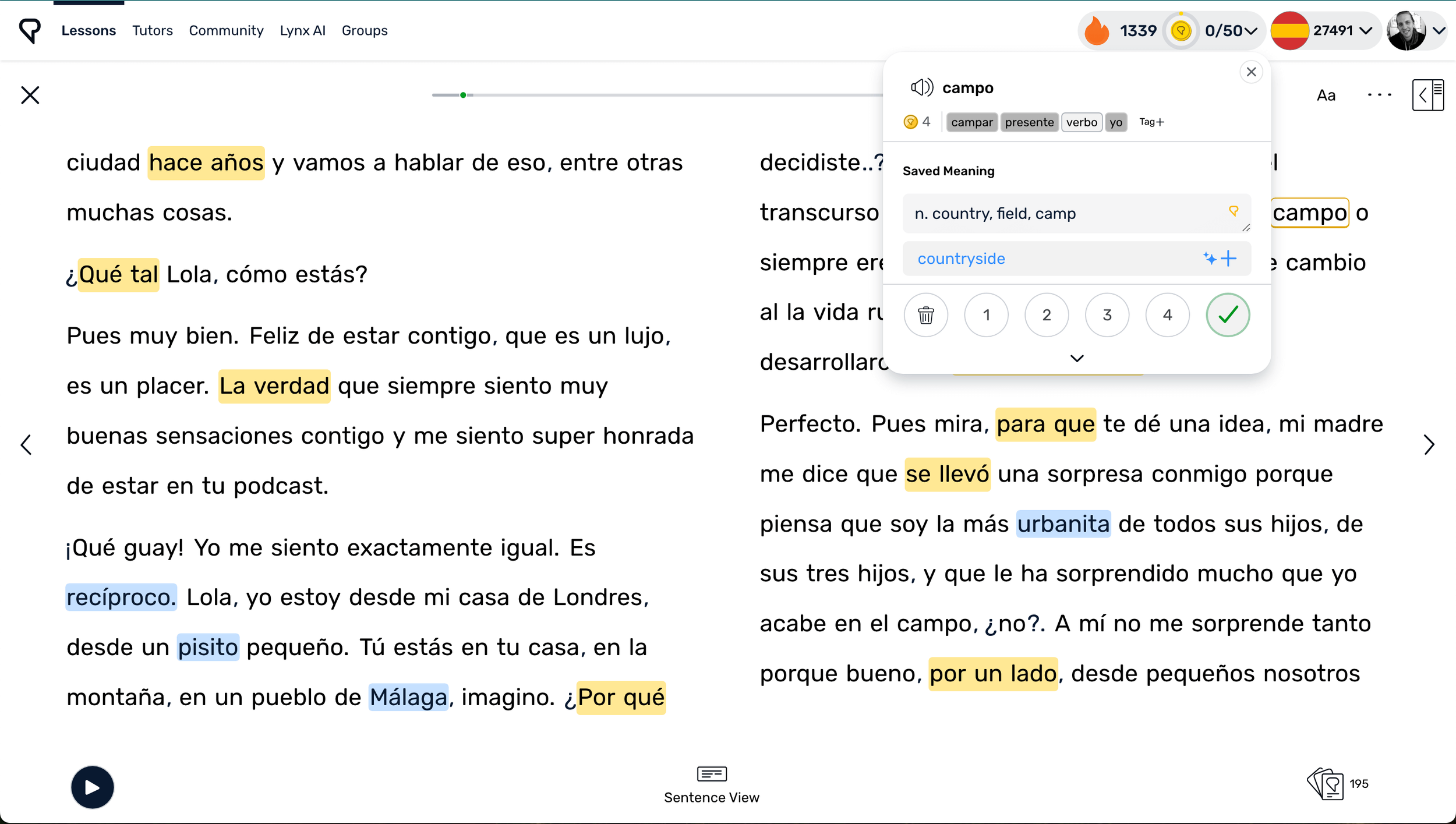LingQ has a large library of Spanish content, and while each lesson offers audio (and generated text-to-speech for imported text) the strength lies in its reading features. The app tracks all your vocabulary across content so there’s no need for review. You simply read, easily look up words with one click, and learn new words and expressions without having to painfully memorize anything. It combines language learning with immersing in topics you’re interested in.