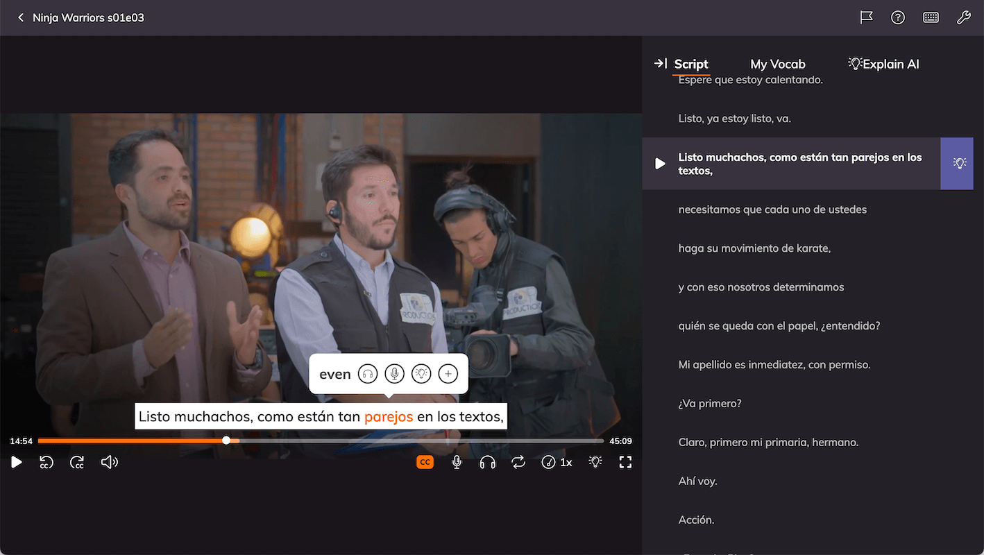 You want to learn from Spanish TV shows, but native content feels overwhelming—too fast, too many unknown words, and pausing to look up things is inconvenient and disrupts the flow. This is what Lingopie is for as it transforms Spanish TV shows into an interactive learning experience.