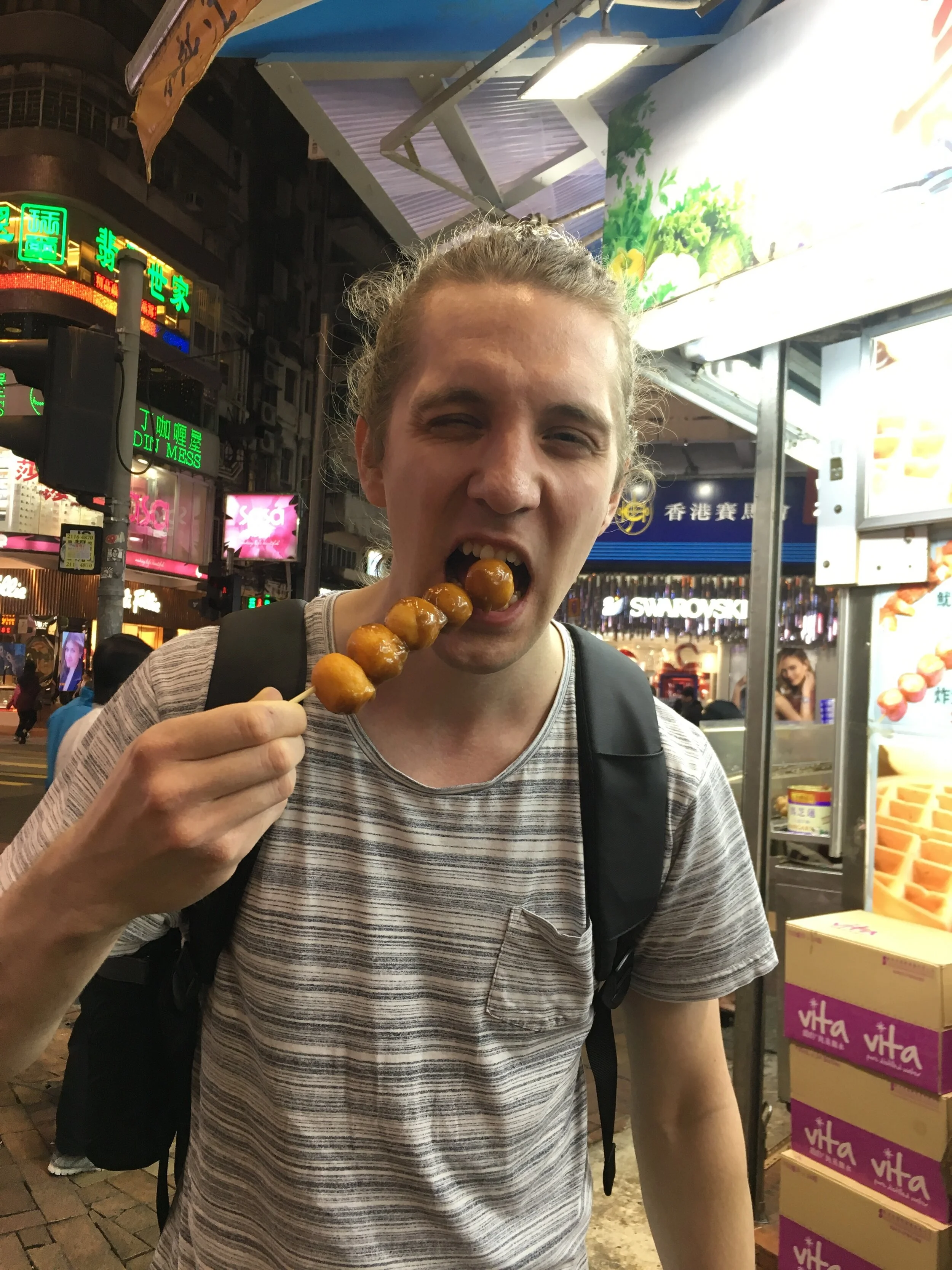 Me enjoying curry fish balls that I had just ordered in Cantonese. Spicy and delicious!