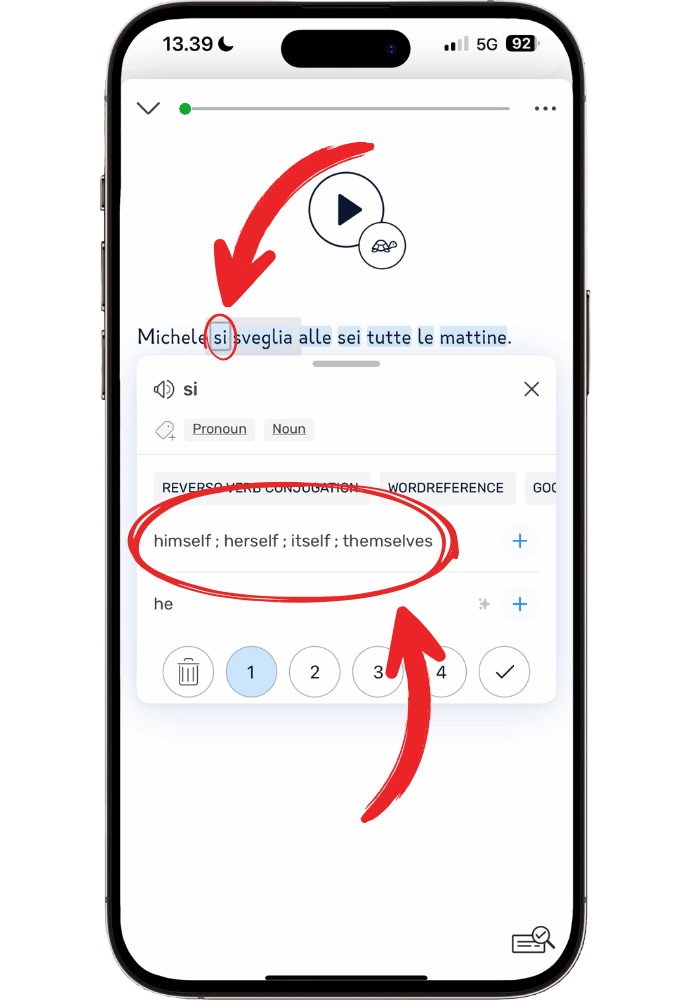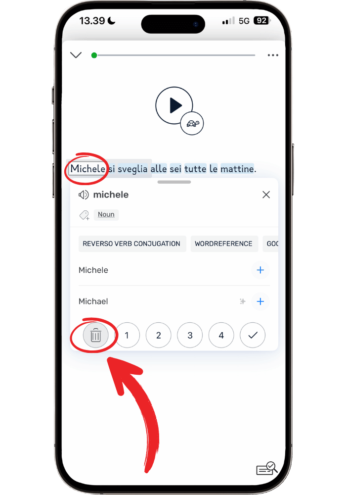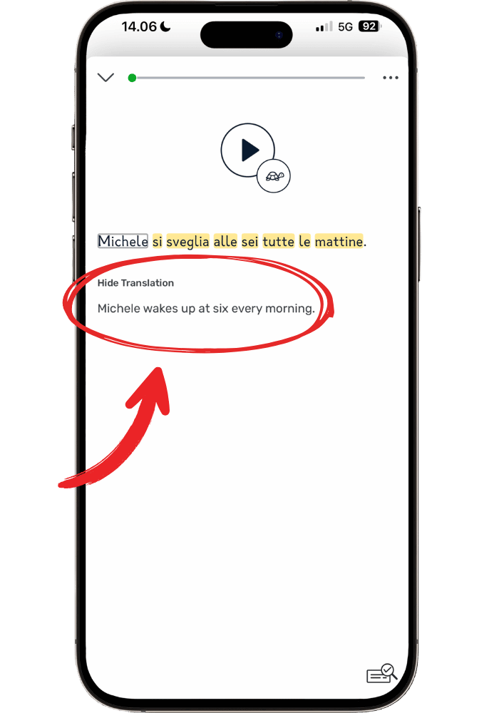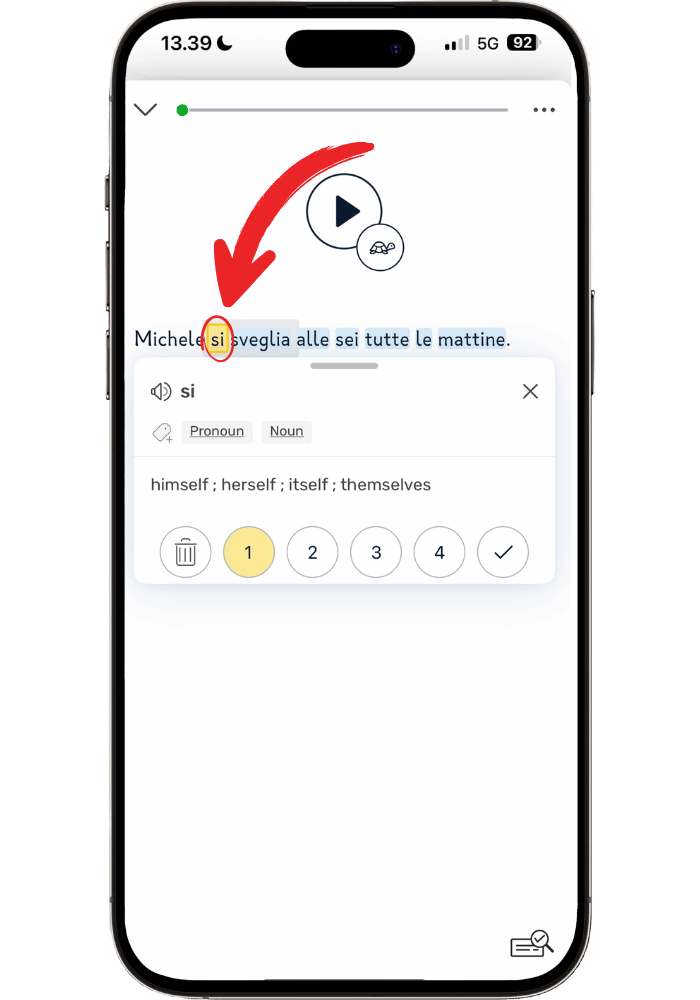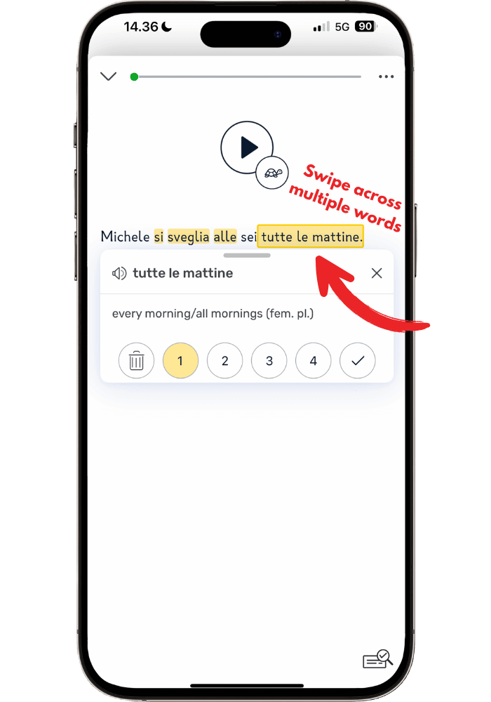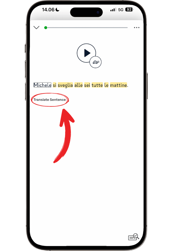 Optional - Listen to the whole sentence: Press the play button ▶️ to hear the sentence spoken by a native speaker. This is even available for books, although there will be a text-to-speech voice instead of a real recording. When purely reading, you don’t have to listen to every single sentence (although I do recommend at least hearing the pronunciation of each word through text-to-speech), but it’s a helpful feature for when you want to hear how the sentence flows.