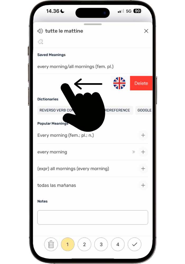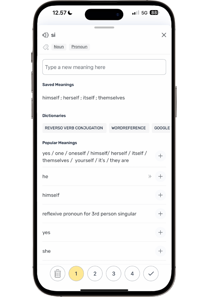 Save Phrases with Multiple Words: A helpful feature is that you can also save whole phrases that contain 2-3 or more words. This is especially helpful when it comes to sayings - as they might only make sense as a whole and not by its separate words. Think "by the way" - the individual words "by," "the," and "way" don't give you the meaning, but together they signal you're about to mention something unrelated to the current topic.