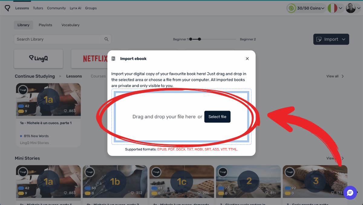 Keep in mind: If your e-book fails to import, it most likely needs to be converted. Jump back to → Converting E-books for LingQ to learn how to do that.