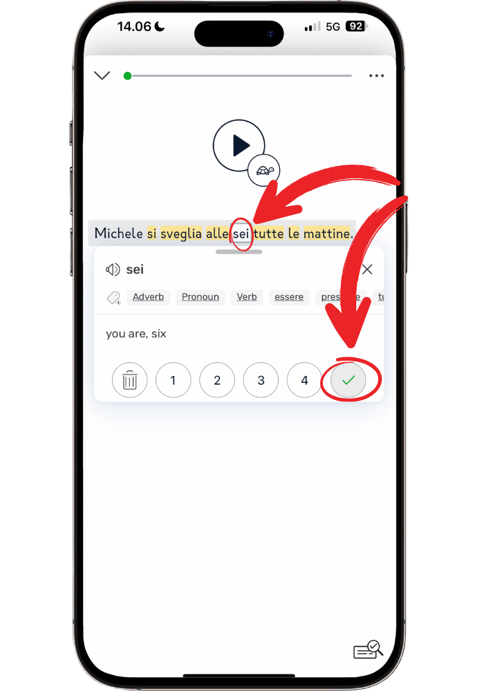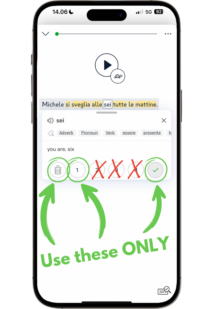Feels overwhelming will all these unknown blue words? No worries! Next, we’ll go into “Sentence Mode” to make things much more manageable. This is a completely new language to us after all.