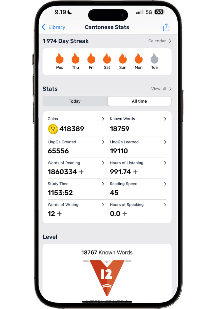 Eventually—if you keep going long enough—your LingQ stats page will eventually look something like my current Cantonese stats: