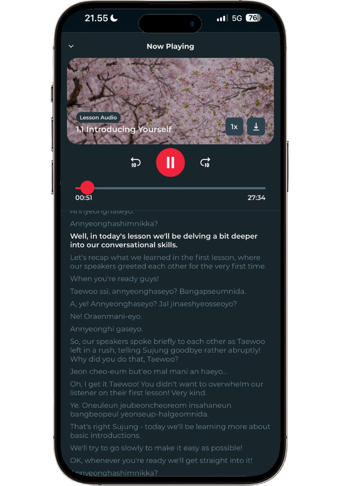Audio lessons (15-45 min) that break down conversations phrase by phrase, along with some cultural insights about Korea and the language