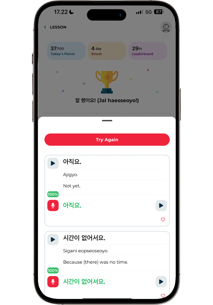 If you say it correctly, it will reveal what it meant + the Korean script (you can also click ‘Reveal’ if you find it too hard to say)
